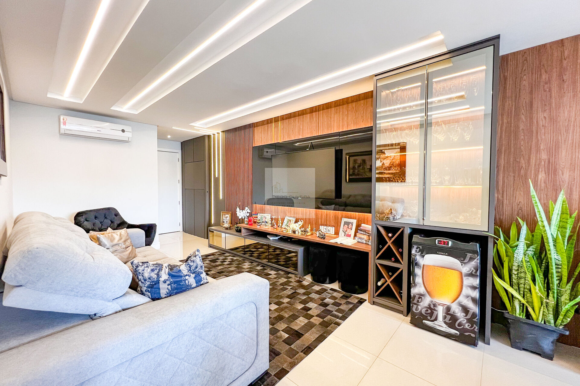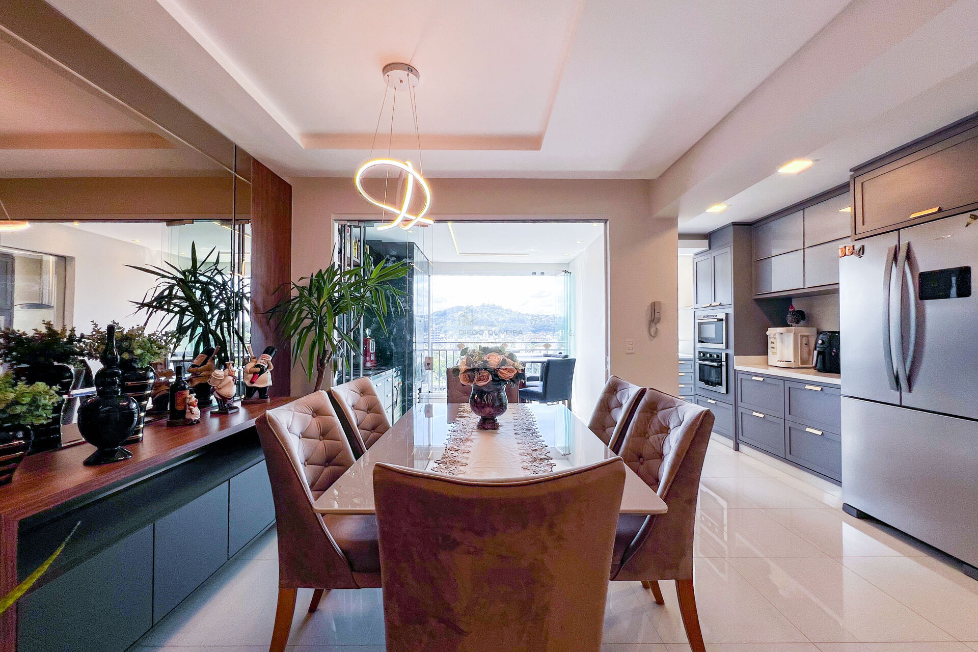 Amplo living com ambiente para TV e Jantar integrados;
